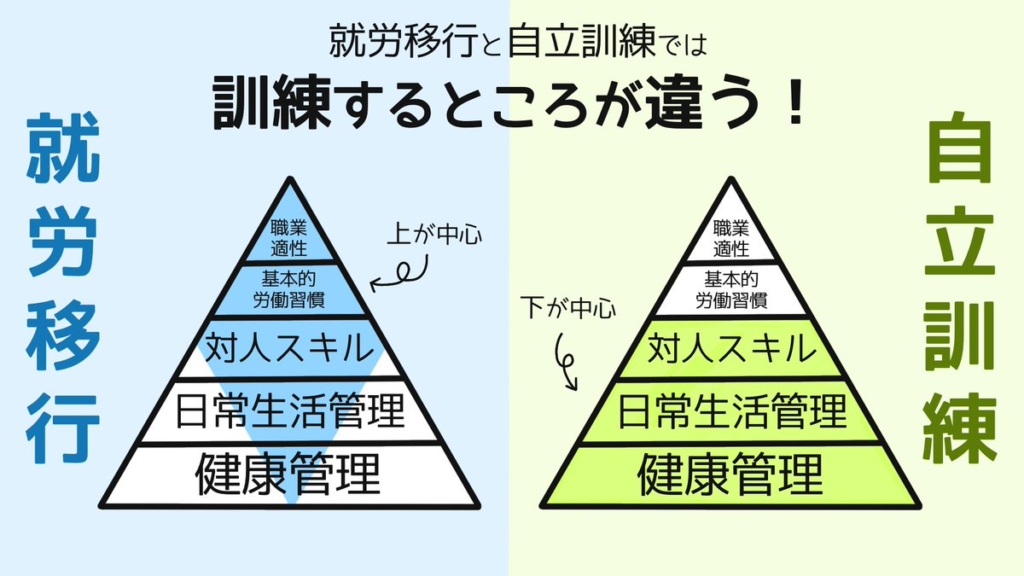 よく比較されるのが「就労移行支援」と「自立訓練(生活訓練)」です。